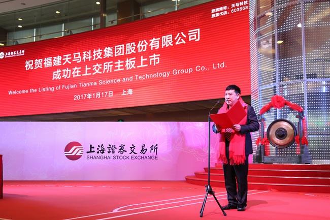 天馬科技訊 1月17日,福建天馬科技集團股份有限公司(證券簡稱“天馬科技”,證券代碼603668)首次公開發(fā)行A股上市儀式在上海證券交易所隆重舉行。天馬科技陳慶堂董事長及福建省福清市人民政府市長張帆,福建省泉州市泉港區(qū)人民政府區(qū)長顏朝暉,海通證券總裁瞿秋平,建設銀行福建省分行副行長王東標,福清市第十六屆人大常委會主任王德玉,政協(xié)泉州市泉港區(qū)第三屆委員會主席連啟明,福清市市委常委、統(tǒng)戰(zhàn)部部長陳存楓,泉州市泉港區(qū)常委、統(tǒng)戰(zhàn)部部長陳龍津,集團董監(jiān)高,行業(yè)協(xié)會、金融機構、客戶代表及上市中介機構代表等出席上市儀式。陳慶堂董事長和福清市張帆市長、上交所領導共同敲響開市銅鑼,標志著特種水產配合飼料領軍企業(yè)、中國飼料工業(yè)協(xié)會副會長單位——天馬科技正式登陸A股市場。