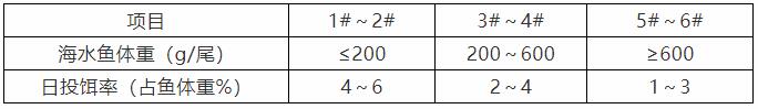 ? 根據網箱或池塘中海水魚規格及數量,參考投餌參考表中推算投餌量,再根據天氣、水溫、水質、海水魚攝食及健康狀況等予以適當調整。
