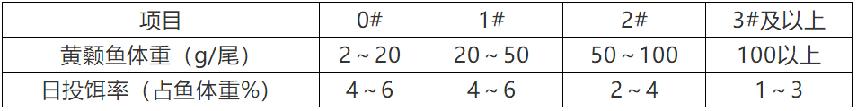 ? 根據(jù)黃顙魚(yú)規(guī)格及數(shù)量,參考投餌參考表中推算投餌量,再根據(jù)天氣、水溫、水質(zhì)、餌料臺(tái)觀察情況、黃顙魚(yú)攝食及健康狀況等予以適當(dāng)調(diào)整。