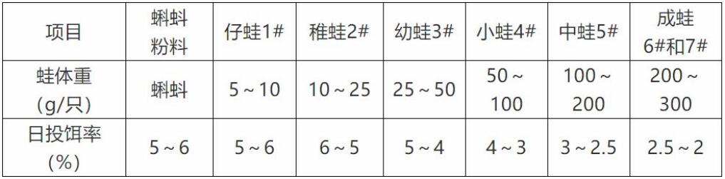 ? 根據蛙規格及數量,參考投餌參考表中推算投餌量,再根據天氣、水溫、水質、餌料臺觀察情況、蛙攝食和健康狀況等予以適當調整。