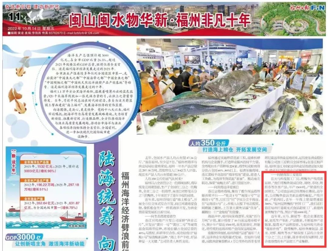 天馬科技訊 10月14日,福州日報刊登專版報道《閩山閩水物華新 福州非凡十年》,報道了天馬科技集團布局鰻魚食品全產(chǎn)業(yè)鏈,以高品質(zhì)預(yù)制菜向精深加工要效益,引領(lǐng)國鰻崛起,引發(fā)了社會的廣泛關(guān)注。報道如下↓↓↓